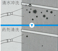 使用的專業藥劑為何分為"清洗劑"和"中和劑"? 因為去污力強的清洗劑往往對翅片有較強的腐蝕性,而溫和型藥劑的清潔能力較弱。 惠馳使用的專業清洗劑保證了強有力的去污能力,而專業中和劑能夠中和清洗劑的腐蝕性,保證翅片不被腐蝕,做到去污,耐腐兩全其美。