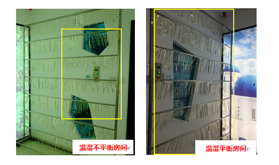 為了更好地檢測中央空調(diào)的出風(fēng)和氣流,在正對空調(diào)出風(fēng)口的對面拜訪了一個流蘇架,這樣就能很清楚地看出空調(diào)的風(fēng)向和風(fēng)速了。